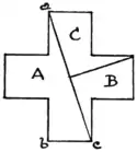 The solution to the first of the two puzzles last given—to cut a rectangle of the shape of a half-square into three pieces that will form a Greek cross—is shown in Figs. 37 and 38. It will be seen that we divide the long sides of the oblong into six equal parts and the short sides into three equal parts, in order to get the points that will indicate the direction of the cuts. The reader should compare this solution with some of the previous illustrations. He will see, for example, that if we continue the cut that divides B and C in the cross, we get Fig. 15.