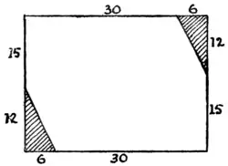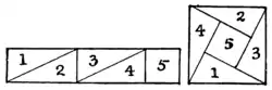 A joiner had two pieces of wood of the shapes and relative proportions shown in the diagram. He wished to cut them into as few pieces as possible so that they could be fitted together, without waste, to form a perfectly square table-top. How should he have done it? There is no necessity to give measurements, for if the smaller piece (which is half a square) be made a little too large or a little too small it will not affect the method of solution.