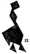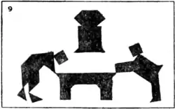 By using several sets of Tangrams at the same time we may construct more ambitious pictures. I was advised by a friend not to send my picture, "A Game of Billiards" (9), to the Academy. He assured me that it would not be accepted because the "judges are so hide-bound by convention." Perhaps he was right, and it will be more appreciated by Post-impressionists and Cubists. The players are considering a very delicate stroke at the top of the table. Of course, the two men, the table, and the clock are formed from four sets of Tangrams.