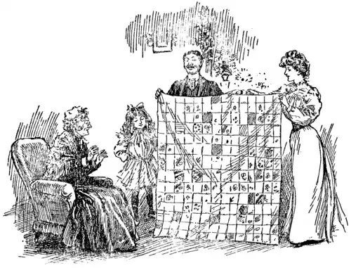 It will be seen that in this case the square patchwork quilt is built up of 169 pieces. The puzzle is to find the smallest possible number of square portions of which the quilt could be composed and show how they might be joined together. Or, to put it the reverse way, divide the quilt into as few square portions as possible by merely cutting the stitches.