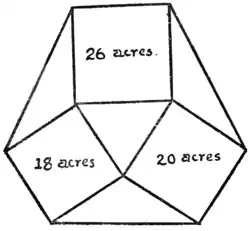 Farmer Wurzel owned the three square fields shown in the annexed plan, containing respectively 18, 20, and 26 acres. In order to get a ring-fence round his property he bought the
