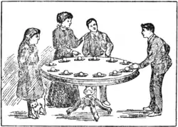 as few times as possible. It does not matter whether the two coins passed over are in one or two plates, nor how many empty plates you pass a coin over. But you must always go in one direction round the table and end at the point from which you set out. Your hand, that is to say, goes steadily forward in one direction, without ever moving backwards.