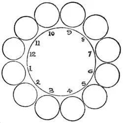 Place twelve plates, as shown, on a round table, with a penny or orange in every plate. Start from any plate you like and, always going in one direction round the table, take up one penny, pass it over two other pennies, and place it in the next plate. Go on again; take up another penny and, having passed it over two pennies, place it in a plate; and so continue your journey. Six coins only are to be removed, and when these have been placed there should be two coins in each of six plates and six plates empty. An important point of the puzzle is to go round the table