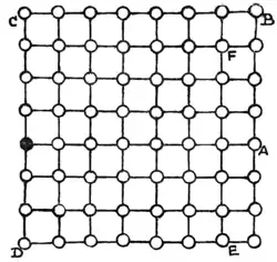 Here is another queer travelling puzzle, the solution of which calls for ingenuity. In this case the traveller starts from the black town and wishes to go as far as possible while making only fifteen turnings and never going along the same road twice. The towns are supposed to be a mile apart. Supposing, for example, that he went straight to A, then straight to B, then