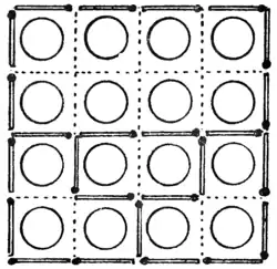 Here is a new puzzle with matches and counters or coins. In the illustration the matches represent hurdles and the counters sheep. The sixteen hurdles on the outside, and the sheep, must be regarded as immovable; the puzzle has to do entirely with the nine hurdles on the inside. It will be seen that at present these nine hurdles enclose four groups of 8, 3, 3, and 2 sheep. The farmer requires to readjust some of the hurdles so as to enclose 6, 6, and 4 sheep. Can you do it by only replacing two hurdles? When you have succeeded, then try to do it by replacing three hurdles; then four, five, six, and seven in succession. Of course, the hurdles must be legitimately laid on the dotted lines, and no such tricks are allowed as leaving unconnected ends of hurdles, or two hurdles placed side by side, or merely making hurdles change places. In fact, the conditions are so simple that any farm labourer will understand it directly.