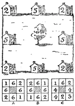 decided to build eight villas, as shown in the illustration, with a common recreation ground in the middle. After the houses were completed, and all or some of them let, he discovered that the number of occupants in the three houses forming a side of the square was in every case nine. He did not state how the occupants were distributed, but I have shown by the numbers on the sides of the houses one way in which it might have happened. The puzzle is to discover the total number of ways in which all or any of the houses might be occupied, so that there should be nine persons on each side. In order that there may be no misunderstanding, I will explain that although B is what we call a reflection of A, these would count as two different arrangements, while C, if it is turned round, will give four arrangements; and if turned round in front of a mirror, four other arrangements. All eight must be counted.