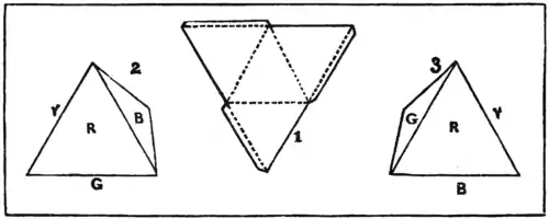 This puzzle concerns the painting of the four sides of a tetrahedron, or triangular pyramid. If you cut out a piece of cardboard of the triangular shape shown in Fig. 1, and then cut half through along the dotted lines, it will fold up and form a perfect triangular pyramid. And I would first remind my readers that the primary colours of the solar spectrum are seven—violet, indigo, blue, green, yellow, orange, and red. When I was a child I was taught to remember these by the ungainly word formed by the initials of the colours, "Vibgyor."