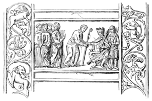 to be meant for an alb. The embroidered collar of one of the group of ladies will be noticed. It seems remarkable that none of the male part of Otho's court should be represented, except his sword-bearer or captain of the guard.