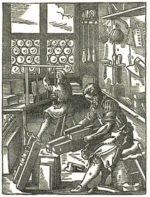 [From Jost Amman.]The annexed illustration of bookbinding, published by Amman in his Book of Trades, puts before us many of the implements still in use. The forwarder, with his customary apron of leather, is in the foreground, making use of a plow-knife for trimming the edges of a book. The lying-press which rests obliquely against the block before him contains a book that has received the operation of backing-up from a queer-shaped hammer lying upon the floor. The workman at the end of the room is sewing together the sections of a book, for sewing was properly regarded as a man's work, and a scientific operation altogether beyond the capacity of the raw seamstress. The work of the finisher is not represented, but the brushes, the burnishers, the sprinklers and the wheel-shaped gilding tools hanging against the wall leave us in no doubt as to their use. There is an air of antiquity about everything connected with this bookbindery which suggests the thought that its tools