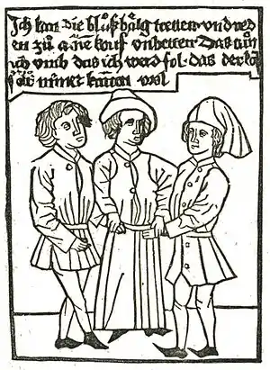 [From Falkenstein.]The pictures illustrate the Go-between, the Liar, the Cheat, the Counterfeit Goldsmith, the Cheating Merchant, the Church Robber, the Cheating Rope-maker, the Blacksmith that sells iron for steel. The designs are rude, but they are full of spirit and character, and the cutting of the figures has been done with ability and intelligence. The paper was printed on one side only and in dull brown ink. This book was found in the neglected library of an old South German monastery, in the heart of the neighborhood in which we find the earliest notices of printers and painters of images. As it is the only block-book of a decidedly non -religious character, it may be ascribed to some maker of playing cards, who practised the art of engraving before it was placed under the control of the Church.