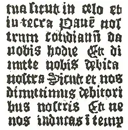 [From Holtrop.]Its types present all the irregularities of the Donatus previously described. The pages have but nine lines of types to each page, yet they are very crooked. This crookedness was partially produced by an unskillful fastening, or locking-up of the types, but it is plain that the types were of irregular size as to body, and that the letters were badly adjusted upon the bodies. Some types are high and others low to paper, and there are types that are legible at one end of the face and not at the other. The presswork is wretched: we see the evidences of too weak and badly distributed ink and of uneven impression. The text shows many faults of composition in the division of syllables.
