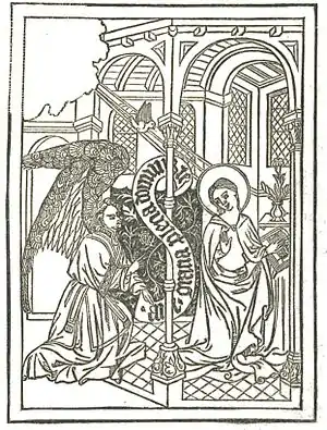 The AnnunciationThese faults of drawing are counterbalanced by real merits of engraving. There is a noticeable thickening and tapering of lines in proper places, a bold and a free marking of the folds of drapery, and a general neatness and cleverness of cutting that indicate the hand of a practised and judicious engraver. This engraving of St. Christopher is obviously not the first experiment of an amateur or an untaught inventor.