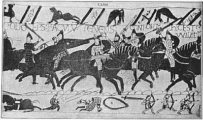 10. WILLIAM RAISES HIS HELMET TO RALLY HIS MEN.11. ODO, BISHOP OF BAYEUX, WIELDING HIS MACE.
