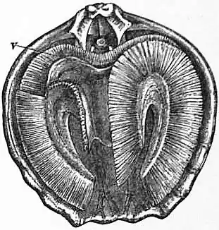 In Terebratella the loop is attached to the hinge-plate and to the septum (fig. 17). In Megerlia it is three times attached, first to the hinge-plate, and then to the septum by processes from the diverging and reflected positions of the loop. In Magas the brachial skeleton is composed of an elevated longitudinal septum reaching from one valve to the other, to which are affixed two pairs of calcareous lamellae, the lower ones riband-shaped; attached first to the hinge-plate, they afterwards proceed by a gentle curve near to the anterior portion of the septum, to the sides of which they are affixed; the second pair originate on both sides of the upper edge of the septum, extending in the form of two triangular anchor-shaped lamellae (fig. 18). In Bouchardia the septum only is furnished with two short anchor-shaped lamellae. Many more modifications are observable in different groups of which the great family Terebratulidae is composed. In Thecidium (figs. 3,4) the interior of the dorsal valve is variously furrowed to receive the lophophore folded in two or more lobes.
