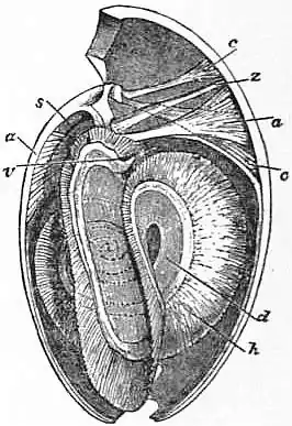 Each valve of the shell is lined by a mantle which contains prolongations of the body cavity. The outer surfaces of the mantle secrete the shell, which is of the nature of a cuticle impregnated by calcareous salts. These often have the form of prisms of calcite surrounded by a cuticular mesh work; the whole is nourished and kept alive by processes, which in Crania are branched; these perforate the shell and permit the access of the coelomic fluid throughout its substance. These canals are closed externally and are absent in Rhynchonella, where the amount of calcareous deposit is small. In Lingula the shell is composed of alternate layers of chitin and of phosphate of lime. The free edges of the mantle often bear chitinous bristles or setae which project beyond the shell. As in the case of the Lamellibranchiata, the shell of the adult is not a direct derivative of the youngest shell of the larva. The young Brachiopod in all its species is protected by an embryonic shell called the “protegulum,” which sometimes persists in the umbones of the adult shells but is more usually worn off. In all species it has the same shape, a shape which has been retained in the adult by the Lower Cambrian genus Iphidea.