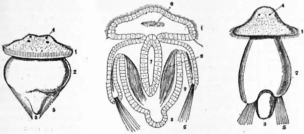 C. E. E. Beecher (Amer. Jour. Sci. ser. 3, xli. and xliv.) has classified with appropriate names the various stages through which Brachiopod larvae pass. The last stage, that in which the folds of the second segment are already reflected over the first, he calls the Typembryo. Either before or just after turning, the mantle develops a larval shell termed the protegulum, and when this is completed the larva is termed the Phylembryo. By this time the eyes have disappeared, the four bundles of chaetae have dropped off, and the lophophore has begun to appear as an outgrowth of the dorsal mantle lobe. The protegulum has been found in members of almost all the families of Brachiopod, and it is thought to occur throughout the group. It resembles the shell of the Cambrian genus Iphidea [Paterina], and the Phylembryo is frequently referred to as the Paterina stage. In some orders the Phylembryo is succeeded by an Obolella stage with a nearly circular outline, but this is not universal. The larva now assumes specific characters and is practically adult.