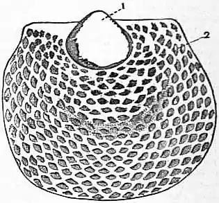 | Fig. 31.—Shell of larval Brachiopod. Phylembryo stage. (From Simroth.) 1, Protegulum; 2, permanent shell. |