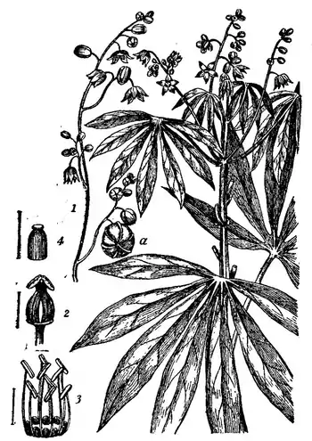 3, Stamens and fleshy disc of male flower. 4, Seed with its appendage (strophiole or caruncle). |