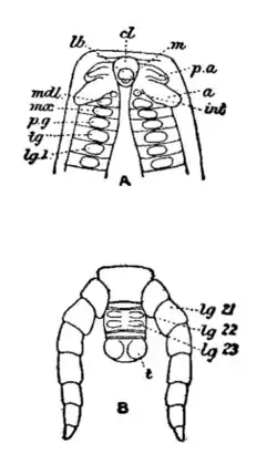 | A, Diagram of anterior extremity of an early embryo of Scolopendra, ventral view; cl, clypeus; lb, labrum; m, mouth; p.a, preantennal appendage; a, antenna; int, premandibular rudiment; mdl, mandible; mx, maxilla; p.g, palpognath; t.g, toxicognath; lg. 1, first pair of walking legs. B, Posterior end of a later embryo of Scolopendra, ventral view, showing the anal segment or telson (t); the legs of the last pair in the adult (lg. 21) and the two rudimentary pairs of legs (lg. 22, lg. 23). |
