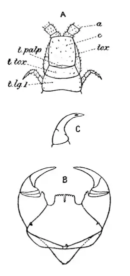 Order 1. Geophilomorpha.—Chilopods with a large and indefinite number of somites, most of which are partially or completely divided into a smaller anterior segment, represented by a pretergal and two presternal sclerites, and a larger posterior segment bearing the spiracles and legs. Spiracles are present upon all the leg-bearing somites except the first and last; and the legs which are short and subequal in length consist of six segments, the basal of which remains small. There are no eyes, and the antennae consist invariably of fourteen segments. The tergal plate of the somite bearing the toxicognaths always remains distinct and separates the head-shield from the tergum of the first leg-bearing somite. The penultimate and antepenultimate segments of the toxicognaths are reduced on the preaxial side of the appendage to the condition of arthrodial integumental folds and suppressed on the postaxial side where the distal segment or fang is firmly jointed to the femoral segment. In the last leg-bearing somite the pleural sclerites coalesce with the coxa of the appendage; but the second segment (trochanter) of this appendage does not fuse with the third (femur). The genital and anal somites are not retractile within the last leg-bearing somite, and the gonopods typically persist in the male as small two-jointed appendages and in the female as jointed or unjointed sclerites. The young are hatched with the full number of segments.