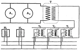 The alternating current systems in operation at the present time are the single-phase system, with distributing transformers or transformer sub-centres, and the polyphase systems, in which the alternating current is transformed down into an alternating current of low pressure, or, by means Alternating supply.of rotatory transformers, into a continuous current. The general arrangement of a single-phase alternating-current system is as follows: The generating station contains a number of alternators, A1 A2 (fig. 5), producing single-phase alternating current, either at 1000, 2000, or sometimes, as at Deptford and other places, 10,000 volts. This current is distributed from the station either at the pressure at which it is generated, or after being transformed up to a higher pressure by the transformer T. The alternators are sometimes worked in parallel, that is to say, all furnish their current to two common omnibus bars on a high-pressure switchboard, and each is switched into circuit at the moment when it is brought into step with the other machines, as shown by some form of phase-indicator. In some cases, instead of the high-pressure feeders starting from omnibus bars, each alternator works independently and the feeders are grouped together on the various alternators as required.