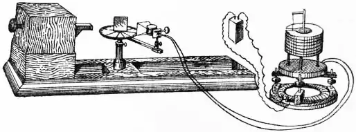 § 8. Generators of Electric Waves.—Bose (Phil. Mag. 43, p. 55) designed an instrument which generates electric waves with a length of not more than a centimetre or so, and therefore allows their properties to be demonstrated with apparatus of moderate dimensions. The waves are excited by sparking between two platinum beads carried by jointed electrodes; a platinum sphere is placed between the beads, and the distance between the beads and the sphere can be adjusted by bending the electrodes. The diameter of the sphere is 8 mm., and the wave length of the shortest electrical waves generated is said to be about 6 mm. The beads are connected with the terminals of a small induction coil, which, with the battery to work it and the sparking arrangement, are enclosed in a metal box, the radiation passing out through a metal tube opposite to the spark gap. The ordinary vibrating break of the coil is not used, a single spark made by making and breaking the circuit by means of a button outside the box being employed instead. The detector is one of the spiral spring coherers previously described; it is shielded from external disturbance by being enclosed in a metal box provided with a funnel-shaped opening to admit the radiation. The wires leading from the coherers to the galvanometer are also surrounded by metal tubes to protect them from stray radiation. The radiating apparatus and the receiver are mounted on stands sliding in an optical bench. If a parallel beam of radiation is required, a cylindrical lens of ebonite or sulphur is mounted in a tube fitting on to the radiator tube and stopped by a guide when the spark is at the principal focal line of the lens. For experiments requiring angular measurements a spectrometer circle is mounted on one of the sliding stands, the receiver being carried on a radial arm and pointing to the centre of the circle. The arrangement is represented in fig. 5.