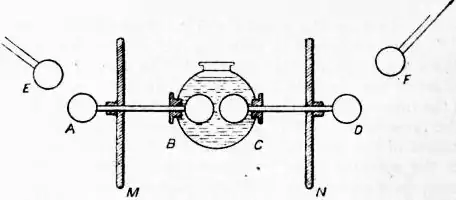 A series of experiments showing the complete analogy between electric and light waves is described by Righi in his book L’Ottica delle oscillazioni elettriche. Righi’s exciter, which is especially convenient when large statical electric machines are used instead of induction coils, is shown in fig. 6. E and F are balls connected with the terminals of the machine, and AB and CD are conductors insulated from each other, the ends B, C, between which the sparks pass, being immersed in vaseline oil. The period of the vibrations given out by the system is adjusted by means of metal plates M and N attached to AB and CD. When the waves are produced by induction coils or by electrical machines the intervals between the emission of different sets of waves occupy by far the largest part of the time. Simon (Wied. Ann., 1898, 64, p. 293; Phys. Zeit., 1901, 2, p. 253), Duddell (Electrician, 1900, 46, p. 269) and Poulsen (Electrotech. Zeits., 1906, 27, p. 1070) reduced these intervals very considerably by using the electric arc to excite the waves, and in this way produced electrical waves possessing great energy. In these methods the terminals between which the arc is passing are connected through coils with self-induction L to the plates of a condenser of capacity C. The arc is not steady, but is continually varying. This is especially the case when it passes through hydrogen. These variations excite vibrations with a period 2π√(LC) in the circuit containing the capacity of the self-induction. By this method Duddell produced waves with a frequency of 40,000. Poulsen, who cooled the terminals of the arc, produced waves with a frequency of 1,000,000, while Stechodro (Ann. der Phys. 27, p. 225) claims to have produced waves with three hundred times this frequency, i.e. having a wave length of about a metre. When the self-induction