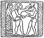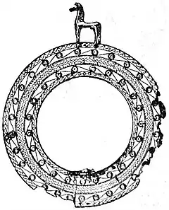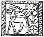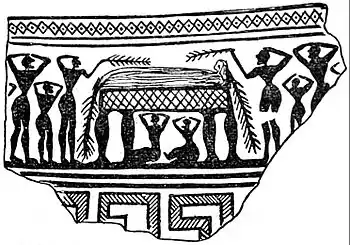 The geometric ware is for the most part adorned with painted patterns only. Fig. 4 is a characteristic example, a small two-handled vase from Rhodes in the Ashmolean Museum, the adornment of which consists in zigzags, circles with tangents, and lines of water birds, perhaps swans. Sometimes, however, especially in the case of large vases from Geometric ware. the cemetery at Athens, which adjoins the Dipylon gate, scenes from Greek life are depicted, from daily life, not from legend or divine myth. Especially scenes from the lying-in-state and the burial of the dead are prevalent. An excerpt from a Dipylon vase (fig. 5) shows a dead man on his couch surrounded by mourners, male and female. Both sexes are apparently represented naked, and are distinguished very simply; some of them hold branches to sprinkle the corpse or to keep away flies. It will be seen how primitive and conventional is the drawing of this age, presenting a wonderful contrast to the free drawing and modelling of the Mycenaean age. In the same graves with the pottery are sometimes found plaques of gold or bronze, and towards the end of the geometric age these sometimes bear scenes from mythology, treated with the greatest simplicity. For example, in the museum of Berlin are the contents of a tomb found at Corinth, consisting mainly of gold work of geometric decoration. But in the same tomb were also found gold plates or plaques of repoussé work bearing subjects from Greek legend. Two of these are shown in fig. 6. On one Theseus is slaying the Minotaur, while Ariadne stands by and encourages the hero. The tale could not have been told in a simpler or more straightforward way. On the other we have an armed warrior with his charioteer in a chariot drawn by two horses. The treatment of the human body is here more advanced than on the vases of the Dipylon. On the site of Olympia, where Mycenaean remains are not found, but the earliest monuments show the geometric style, a quantity of dedications in bronze have been found, the decoration of which belongs to this style. Fig. 7 shows the handle of a tripod from Olympia, which is adorned with geometric patterns and surmounted by the figure of a horse.