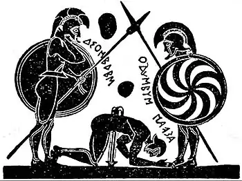 In fig. 13, from a Corinthian vase, Ajax falls on his sword in the presence of his colleagues, Odysseus and Diomedes. The short stature of Odysseus is a well-known Homeric feature. These vases are black-figured; the heroes are painted in silhouette on the red ground of the vases. Their names are appended in archaic Greek letters.