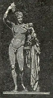 Until about the year 1880, our knowledge of the great Greek sculptors of the 4th century was derived mostly from the statements of ancient writers and from Roman copies, or what were supposed to be copies, of their works. We are now in a far more satisfactory position. We now possess an original work of Praxiteles, and Praxiteles. sculptures executed under the immediate direction of, if not from the hand of, other great sculptors of that age—Scopas, Timotheus and others. Among all the discoveries made at Olympia, none has become so familiar to the artistic world as that of the Hermes of Praxiteles. It is the first time that we have become possessed of a first-rate Greek original by one of the greatest of sculptors. Hitherto almost all the statues in our museums have been either late copies of Greek works of art, or else the mere decorative sculpture of temples and tombs, which was by the ancients themselves but little regarded. But we can venture without misgiving to submit the new Hermes to the strictest examination, sure that in every line and touch we have the work of a great artist. This is more than we can say of any of the literary remains of antiquity—poem, play or oration. Hermes is represented by the sculptor (fig. 43 and Plate VI. fig. 82) in the act of carrying the young child Dionysus to the nymphs who were charged with his rearing. On the journey he pauses and amuses himself by holding out to the child-god a bunch of grapes, and watching his eagerness to grasp them. To the modern eye the child is not a success; only the latest art of Greece is at home in dealing with children. But the Hermes, strong without excessive muscular development, and graceful without leanness, is a model of physical formation, and his face expresses the perfection of health, natural endowment and sweet nature. The statue can scarcely be called a work of religious art in the modern or Christian sense of the word religious, but from the Greek point of view it is religious, as embodying the result of the harmonious development of all human faculties and life in accordance with nature.