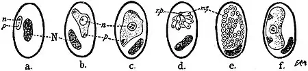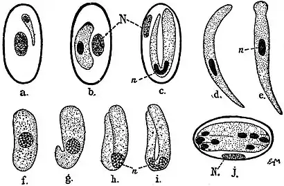 b, Older trophozoite. c, Full-grown trophozoite, ready to leave the corpuscle. d and e, Trophozoites free in the blood-plasma, showing changes of form. f-i, Trophozoites, still within the blood-corpuscle (not drawn), showing the structure of the nucleus, the coarse chromatoid granules in the protoplasm and the manner in which the parasite grows into the j, Commencement of sporulation; the nucleus has divided into eight nuclei, and the body of the parasite is beginning to divide up into as many merozoites within a blood-corpuscle. N, Nucleus of the blood-corpuscle. n, Nucleus of the parasite. |