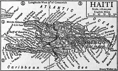 HAITI [Haïti, Hayti, San Domingo, or Hispaniola], an island in the West Indies. It lies almost in the centre of the chain and, with the exception of Cuba, is the largest of the group. Its greatest length between Cape Engano on the east and Cape des Irois on the west is 407 m., and its greatest breadth between Cape Beata on the south and Cape Isabella on the north 160 m. The area is 28,000 sq. m., being rather less than that of Ireland. From Cuba, 70 m. W.N.W., and from Jamaica, 130 m. W.S.W., it is separated by the Windward Passage; and from Porto Rico, 60 m. E., by the Mona Passage. It lies between 17° 37′ and 20° 0′ N. and 68° 20′ and 74° 28′ W. From the west coast project two peninsulas. The south-western, of which Cape Tiburon forms the extremity, is the larger. It is 150 m. long and its width varies from 20 to 40 m. Columbus landed at Mole St Nicholas at the point of the north-western peninsula, which is 50 m. long, with an average breadth of 40 m. Between these lies the Gulf of Gonaïve, a triangular bay, at the apex of which stands the city of Port-au-Prince. The island of Gonaïve, opposite the city at a distance of 27 m., divides the entrance to Port-au-Prince into two fine channels, and forms an excellent harbour, 200 sq. m. in extent, the coral reefs along the coast being its only defect. On the north-east coast is the magnificent Bay of Samana, formed by the peninsula of that name, a mountain range projecting into the sea; its mouth is protected by a coral reef stretching 812m. from the south coast. There is however, a good passage for ships, and within lies a safe and beautiful expanse of water 300 sq. m. in extent. Beyond Samana, with the exception of the poor harbour of Santo Domingo, there are no inlets on the east and south coasts until the Bays of Ocoa and Neyba are reached. The south coast of the Tiburon peninsula has good harbours at Jacmel, Bainet, Aquin and Les Cayes or Aux Cayes. The only inlets of any importance between Aux Cayes and Port-au-Prince are Jeremie and the Bay of Baraderes. The coast line is estimated at 1250 m.