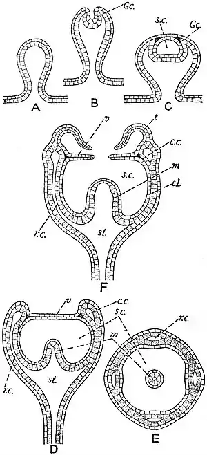 The first stage is a simple hollow outgrowth of both body-layers (fig. 44, A); at the tip of this is formed a thickening of the ectoderm, arising primitively as a hollow ingrowth (fig. 44, B), but more usually as a solid mass of ectoderm-cells (fig. 45, A). The ectodermal ingrowth is the entocodon (Gc.); it bulges into, and pushes down, the endoderm at the apex of the bud, and if solid it soon acquires a cavity (fig. 44, C, s.c.). The cavity of the entocodon increases continually in size, while the endoderm pushes up at the sides of it to form a cup with hollow walls, enclosing but not quite surrounding the entocodon, which remains in contact at its outer side with the ectoderm covering the bud (fig. 44, D, v). The next changes that take place are chiefly in the endoderm-cup (fig. 44, D, E); the cavity between the two walls of the cup becomes reduced by concrescence to form the radial canals (r.c.), ring-canal (c.c.), and endoderm-lamella (e.l., fig. 44, E), and at the same time the base of the cup is thrust upwards to form the manubrium (m), converting the cavity of the entocodon into a