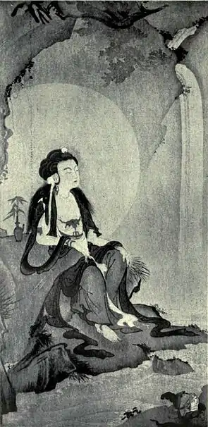 | Fig. 6.—KWANNON, GODDESS OF MERCY. By Mincho or Cho Densu (1352–1431). | Fig. 7.—LANDSCAPE IN SNOW. By Kano Motonobu (1476–1559). | Fig. 8.—JUROJIN. By Sesshiu (1420–1506). |