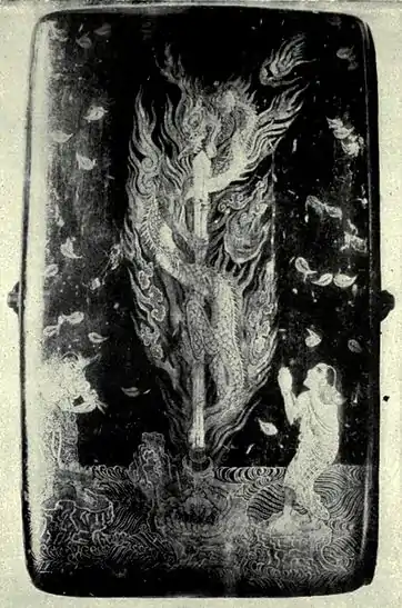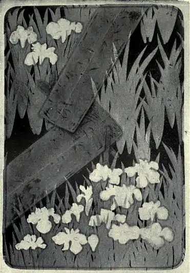 | Fig. 18.—LID OF BOX. By Korin. | Fig. 19.—CASE FOR HEAD OF A SKAKUJO. | Fig. 20.—OWL ON A BRANCH. By Ritsuo. | ||||||
