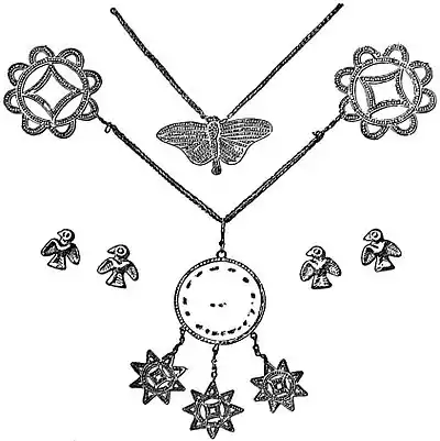 The art of the nameless Memphite jewellers of the XIIth Dynasty is marked by perfect accuracy of execution, by sureness of intention, by decorative instinct and sobriety in design, and by the serviceable nature of the jewels for actual wear. All forms of work are represented—including chiselling, soldering, inlaying with coloured stones, moulding and working with twisted wires and filigree. Here also occurs the earliest instance of granulated work, with small grains of gold, soldered on a flat surface (fig. 1). The principal items in this dazzling group are the following: Three gold pectorals (fig. 2 and Plate I. figs. 35, 36) worked à jour (with the interstices left open); on the front side they are inlaid with coloured stones, the fine cloisons being the only portion of the gold that is visible; on the back, the gold surfaces are most delicately carved, in low relief. Two gold crowns (Plate I. figs. 32, 34), found together, are curiously contrasted in character. The one (fig. 32) is of a formal design, of gold, inlaid (the plume, Plate I. fig 33, was attached to it); the other (fig. 34) has a multitude of star-like flowers, embodied in a filigree of daintily twisted wires. A dagger with inlaid patterns on the handle shows extraordinary perfection of finish.
