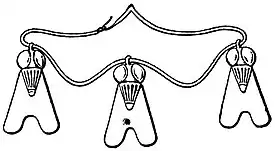 A diadem of gold and enamel, found at the back of the head of the mummy of the queen (fig. 3), was fixed in the back hair, showing the cartouche in front. The box holding this cartouche has on the upper surface the titles of the king, “the son of the sun, Aahmes, living for ever and ever,” in gold on a ground of lapis lazuli, with a chequered ornament in blue and red pastes, and a sphinx couchant on each side. A necklace with three pendant flies (fig. 4) is entirely of gold, having a hook and loop to fasten it round the neck. Fig. 5 is a gold drop, inlaid with turquoise or blue paste, in the shape of a fig. A gold
