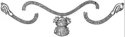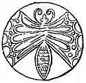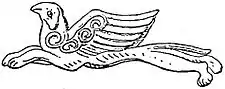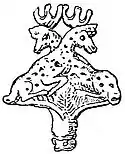 The objects found ranged over most of the personal ornaments still in use; necklaces with gold beads and pendants, butterflies (fig. 10), cuttlefish (fig. 11), single and concentric circles, rosettes and leafage, with perforations for attachment to clothing, crosses and stars formed of combined crosses, with crosses in the centre forming spikes—all elaborately ornamented in detail. The spiral forms an incessant decoration from its facile production and repetition by means of twisted gold wire. Grasshoppers or tree crickets in gold repoussé suspended by chains and probably used for the decoration of the hair, and a griffin (fig. 12), having the upper part of the body of an eagle and the lower parts of a lion, with wings decorated with spirals, are among the more remarkable examples of perforated ornaments for attachment to the clothing. There are also perforated ornaments belonging to necklaces, with intaglio engravings of such subjects as a contest of a man and lion, and a duel of two warriors, one of whom stabs his antagonist in the throat. There are also pinheads and brooches formed of two stags lying down (fig. 13), the bodies and necks crossing each other, and the horns meeting symmetrically above the heads, forming a finial. The heads of these ornaments were of gold, with silver blades or pointed pins inserted for use. The bodies of the two stags rest on fronds of the date-palm growing out of the stem which receives the pin. Another remarkable series is composed of figures of women with doves. Some have one dove resting on the head; others have three doves, one on the head and the others resting on arms. The arms in both instances are extended to the elbow, the hands being placed on the breasts. These ornaments are also perforated, and were evidently sewed on the dresses, although there is some evidence that an example with three doves has been fastened with a pin.