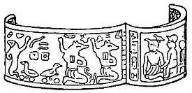 That the Assyrians used personal decorations of a very distinct character, and no doubt made of precious materials, is proved by the bas-reliefs from which a considerable collection of jewels could be gathered, such as bracelets, ear-rings and necklaces. Thus, for example, in the British Museum we have representations of Assur-nazir-pal, king of Assyria (c. 885–860 B.C.), wearing a cross (fig. 8) very similar to the Maltese cross of modern times. It happens, however, that the excavations have not hitherto been fertile in actual remains of gold work from Assyria. Chance also has so far ordained that the excavations in Crete should not be particularly rich in ornaments of gold. A few isolated objects have been found, such as a duck and other pendants, and also several necklaces with beads of the Argonaut shell-fish pattern. More striking than these is a short bronze sword. The handle has an agate pommel, and is covered with gold plates, engraved with spirited scenes of lions and wild goats (fig. 9, A. J. Evans in Archaeologia, 59, 447). In general, however, the gold jewelry of the later Minoan periods is more brilliantly represented by the finds made on the mainland of Greece and at Enkomi in Cyprus. Among the former the gold ornaments found by Heinrich Schliemann in the graves of Mycenae are pre-eminent.