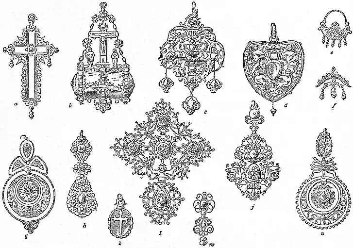 and 18th centuries or the style affected at the close of the second empire—light pierced work and design borrowed from natural flowers. The last type, introduced by Massin, had exercised, indeed, a revolutionary influence on the treatment of jewelry. This clever artist, not less skilful as a craftsman, produced a new genre by copying the grace and lightness of living blossoms, thus introducing a perfectly fresh element into the limited variety of traditional style, and by the use of filigree gold work altering its character and giving it greater elegance. Massin still held the first rank in the exhibition of 1878; he had a marked influence on his contemporaries, and his name will be remembered in the history of the goldsmith’s art to designate a style and a period. Throughout these years the craft was exclusively devoted to perfection of workmanship. The utmost finish was aimed at in the mounting and setting of gems; jewelry was, in fact, not so much an art as a high-class industry; individual effort and purpose were absent.