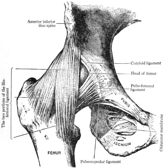 Comparative Anatomy.—Bland Sutton regards the ilio-femoral ligament as an altered muscle, the scansorius, though against this is the fact that, in those cases in which a scansorius is present in Man, the ligament is as strong as usual, and indeed, if it were not there in these cases, the erect position would be difficult to maintain. He also looks upon the ligamentum teres as the divorced tendon of the pectineus muscle. The subject requires much more investigation, but there is every reason to believe that it is a tendon which has sunk into the joint, though whether that of the pectineus is doubtful, since the intra-capsular tendon comes from the ischium in Reptiles. In many Mammals, and among them the Orang, there is no ligamentum teres. In others, such as the Armadillo, the structure has not sunk right into the joint, but is connected with the pubo-femoral part of the capsule.
