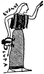 There are three lines of evidence that establish the difference between the lyre and cithara: (1) There are certain vase paintings in which the name λύρα accompanies the drawing of the instrument, as, for instance, in fig. 2 where the tortoise-shell lyre is obviously represented.[1] (2) In all legends accounting for the invention of the lyre, the shell or body of the tortoise is invariably mentioned as forming the back of the instrument, whereas the tortoise has never been connected with the cithara. (3) The lyre is emphatically distinguished as the most suitable instrument for the musical training of young men and maidens and as the instrument of the amateur, whereas the cithara was the instrument of citharoedus or citharista, professional performers at the Pythian Games, at ceremonies and festivals, the former using his instrument to accompany epic recitations and odes, the latter for purely instrumental music. The costume worn by citharoedus and citharista was exceedingly rich and quite distinct from any other.[2]