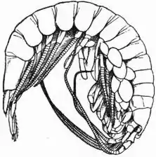 3. Schizopoda.—This order of animals for the most part delicately beautiful, has for the moment five families—Lophogastridae, Eucopiidae, Euphausiidae, Mysidae and Anaspididae. In the Euphausiidae the digitiform-arborescent branchiae, as if conscious of their own extreme elegance, remain wholly uncovered. In the two preceding families they are partially covered. In the Mysidae the branchiae are wanting, and some would form this family into a separate order, Mysidacea. In Anaspides, a peculiar fresh-water genus discovered in 1892 by G. M. Thomson on Mount Wellington, in Tasmania, the gills are not arborescent, and there are seven segments of the trunk free of the carapace (fig. 2). A membranaceous carapace separates the Eucopiidae from the more solidly invested Lophogastridae. Among many papers that the student will find it necessary to consult may be mentioned the “Challenger” Report on Schizopoda, by Sars, 1885, dealing with the order at large; “British Schizopoda,” by Norman Ann. Nat. Hist. (1892); “Decapoden und Schizopoden,” Plankton-Expedition (Ortmann, 1893); “Euphausiidae,” by Stebbing, Proc. Zool. Soc. (London, 1900); Mysidae of the Russian Empire, by Czerniavski (1882–1883); and Mysidae of the Caspian, by Sars (1893–1895–1897).