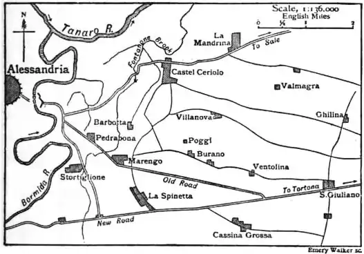 The French army, in ignorance of its opponent’s position, had advanced westward from the Scrivia towards Alessandria on the 12th, and its outposts had reached the Bormida on the evening of the 13th. But contact with the main Austrian army was not obtained, and on the assumption that it was moving towards either Valenza or Genoa Napoleon weakened his army by considerable detachments sent out right and left to find the enemy and to delay his progress. Unknown, however, to Napoleon Melas’s army was still at Alessandria, and on the morning of the 14th of June it filed out of the fortress and began its advance into the great plain of Marengo, one of the few favourable cavalry battle-grounds in north Italy.