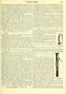 Although a bass keyed-bugle, the ophicleide owes something of its origin to the application of keys to the serpent (q.v.), a wind instrument, the invention of which is generally attributed to Edme Guillaume, canon of Auxerre, about 1590. The serpent remained in its primitive form for nearly two centuries, and then only it was attempted to improve it by adding keys. It was a musician named Regibo, ^ belonging to the orchestra of the church of St Pierre at Lille, who, about 1780, first thought of giving it the shape of a bassoon. The merit of this innovation was rapidly recognized in England and Germany. Still, to follow Gerber, ^ one Frichot, who was established in London, published in 1800 a description of an instrument, entirely of brass, manufactured by J. Astor, which he claimed as his invention, calling it the basshorn, but which was no other in principle than the new serpent of Regibo. It only made its way to France and Belgium after the passage of the allied armies in 1815. The English brass basshorn was designated on the Continent the English or the Russian basshorn, the " serpent anglais " or the " basson russe." Under this last name all instruments of the form, whether of wood or brass, were later on confounded in France and Belgium. The " basson russe " remained in great vogue until the appearance of the ophicleide, to disappear with it in the complete revolution brought about by the invention of pistons.