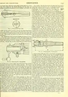 on its front face a coned copper ring which fitted into a coned seating at the breech end of the powder chamber. The breech block was secured by means of a powerful breech screw; a hole was made through the screw so that, in loading, the shell and cartridge could be passed through it after the breech block had been removed. After loading, the block was dropped into its place and the breech screw turned rapidly so that it might jam I the block against its seating, and so prevent the escape of powder gas when the gun was fired. This gun was most successful, and a great number of guns of this type were soon introduced into the British army and navy.