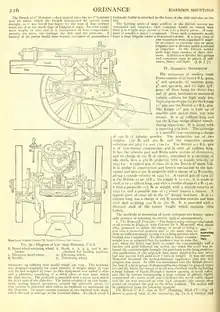transport, 24 vehicles that would weigh 130 tons. The howitzer was designed originally for coast defence; it weighs about 5 1 tons and its bed weighed 6 J tons: to this equipment was added a slide and a platform, consisting of a thick plate of iron upon which the slide moves. The platform is provided with a pivot upon which the front part of the slide fits. The latter consists of an iron framework, having lateral movement around the aforesaid pivot; its rear portion is provided with rollers to facilitate its movement on the platform. Its upper portion consists of two inclined rails along which the bed or carriage of the howitzer slides. To check recoil a