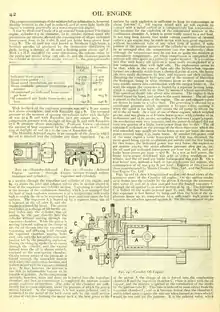 proceeds, however, more and more air is forced into the vaporizer chamber, and just as compression is completed the mixture attains proper explosive proportions. The sides of the chamber are sufficiently hot to cause explosion, under the pressure of which the piston moves forward. As the vaporizer A is not water-jacketed, and is connected to the metal of the back cover only by the small section or area of cast-iron forming the metal neck a, the heat given to the surface by each explosion is sufficient to keep its temperature at about 700-800° C. Oil vapour mixed with air will explode by contact with a metal surface at a comparatively low temperature; this accounts for the explosion of the compressed mixture m the combustion chamber A, which is never really raised to a red heat. It has long been known that under certain conditions of internal surface a gas engine may be made to run with very great regularity, without incandescent tube or any other form of igniter, if some portion of the interior surfaces of the cylinder or combustion space be so arranged that the temperature can rise moderately; then, although the temperature may be too low to ignite the mixture at atmospheric temperature, yet when compression is completed the mixture will often ignite in a perfectly regular manner. It is a curious fact that with heavy oils ignition is more easily accomplished at a low temperature than with light oils. The explanation seems to be that, while in the case of light oils the hydrocarbon vapours formed are tolerably stable from a chemical point of view, the heavy oils very easily decompose by heat, and separate out their carbons, liberating the combined hydrogen, and at the moment of liberation the hydrogen, being in what chemists know as the nascent state, very readily enters into combination with the oxygen beside it. To start the engine the vaporizer is heated by a separate heating lamp, which is supplied with an air blast by means of a hand-operated fan. This operation should take about nine minutes. The engine is then moved round by hand, and starts in the usual manner. The oil tank is placed in the bed plate of the engine. The air and exhaust valves are driven by cams on a valve shaft. The governing is effected by a centrifugal governor which operates a by-pass valve, opening it when the speed is too high, and causes the oil pump to return the oil to the oil tank. At a test of one of these engines, which weighed 40 cwt. and was given as of 8 brake horse-power, with cylinder 10 in. in diameter and 15 in. stroke, according to Professor Capper’s report, the revolutions were very constant, and the power developed did not vary one quarter of a brake horse-power from day to day. The oil consumed, reckoned on the average of the three days over which the trial extended, was ·919 ℔ per brake horse-power per hour, the mean power exerted being 8·35 brake horse. At another full-power trial of the same engine a brake horse-power of 8·57 was obtained, the mean speed being 239·66 revolutions per minute and the test lasting for two hours; the indicated power was 10·3 horse, the explosions per minute 119·83, the mean effective pressure 28·9 per sq. in., the oil used per indicated horse-power per hour was ·81 ℔, and per brake horse-power per hour —·977 ℔. In a test at half power, the brake horse-power developed was 4·57 at 235·9 revolutions per minute, and the oil used per brake horse-power was 1·48 ℔. On a four hours’ test, without a load, at 240 revolutions per minute, the consumption of oil was 4·23 ℔ per hour. Engines of this class are those manufactured by Messrs Crossley Bros., Ltd., and the National Gas Engine Co., Ltd.
