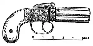 In 1865, Sharp, an American, patented an invention to remedy the escape of gas, in which the four barrels of the pistol were drilled the full length out of one block of metal. The barrels were slid forward by an under lever to load, and the firing was effected by a revolving head to the hammer, set by the action of cocking the pistol.
