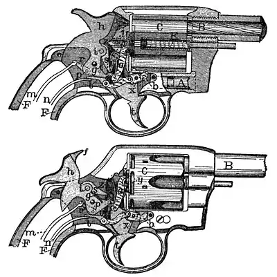 The lock mechanism consists of the hammer (h), with its stirrup (r), stirrup pin (p), strut (s), strut pin (i), strut spring (g); the trigger (t); the rebound lever (l); the hand (a), with the spring (z); the cylinder bolt (b), with its spring (x); the locking ever (v); the main spring (m), and rebound lever spring (n). The hammer (h), trigger (t), and rebound lever (l) are pivoted on their respective pins, which are fastened in the left side of the frame. The lower end of the rebound lever spring (n) is secured to the frame and the free end bears under the rear end of the rebound lever so that the latter, when the trigger is released, cams the hammer back to its safety position, and forces the trigger forward. Pressure upon the trigger causes its upper edge to engage the strut, and thereby raises the hammer until nearly in the full-cock position, when the strut will escape from the trigger, and the hammer, under the action of the main-spring, will fall and strike the cartridge. A projection on the upper part of the trigger, working in a sot in the frame, prevents the cylinder from making more than one-sixth of a revolution at a time by entering one of the grooves nearest the rear end of the surface of the cylinder. When the cylinder is swung out of the frame, the arts are arranged to prevent the cocking of the hammer. The cylinder bolt is pivoted on the trigger pin, and its spring, bearing on the rebound lever arm, causes the nose of the bolt to project through a slot in the frame ready to enter one of the rectangular cuts in the cylinder surface. During the first movement of the trigger in cocking the revolver, the nose of the bolt is withdrawn, allowing free rotation of the cylinder. The object of the bolt is to prevent rotation of the cylinder in transportation The hand is attached by its pivot to the trigger, and, as the latter swings on its pin when the hammer is being cocked, the hand is raised and revolves the cylinder, and also serves to lock the cylinder in position at the time of firing. An abutment on the side plate supports the hand spring in rear The spring ensures the engagement of the hand with the ratchet (y). The revolver is cocked by hand by withdrawing the hammer by the pressure of the thumb until its full-cock notch engages in the rear sharp corner of the trigger. Pulling the trigger then releases the hammer, allowing its firing pin (f) to move forward and strike the cartridge.